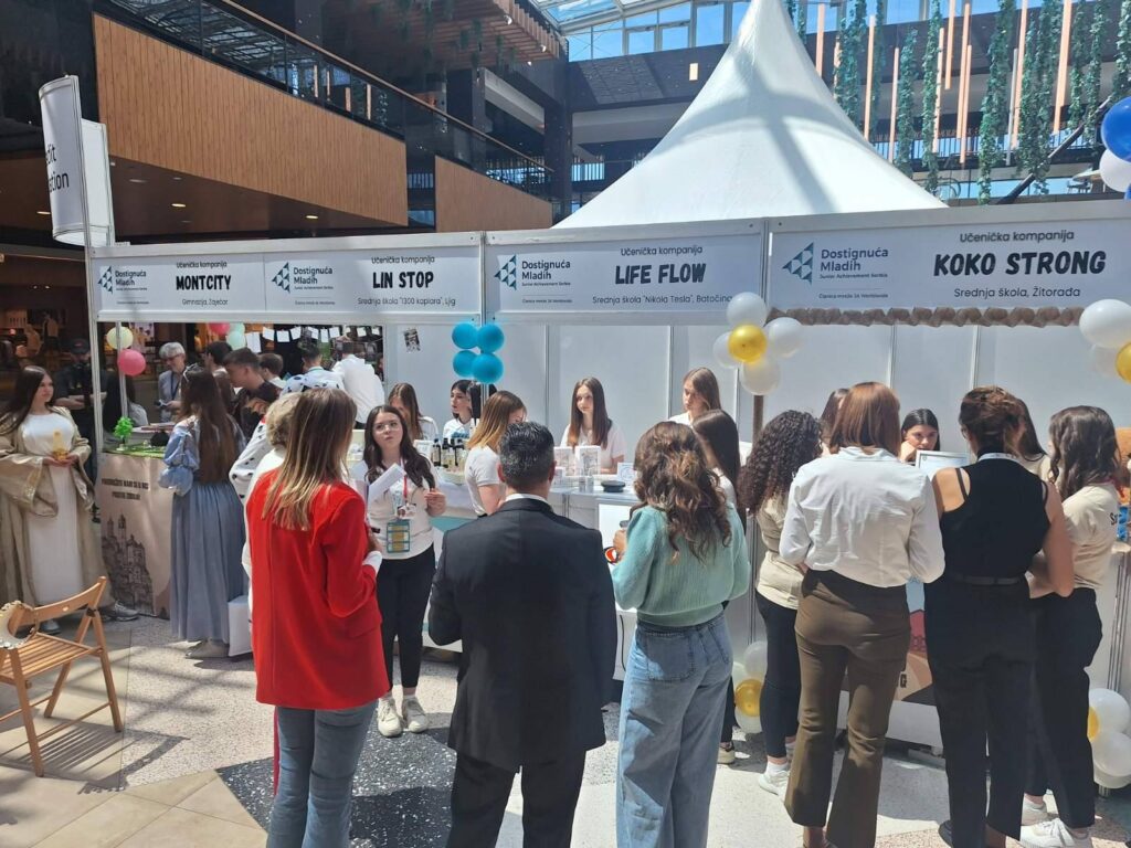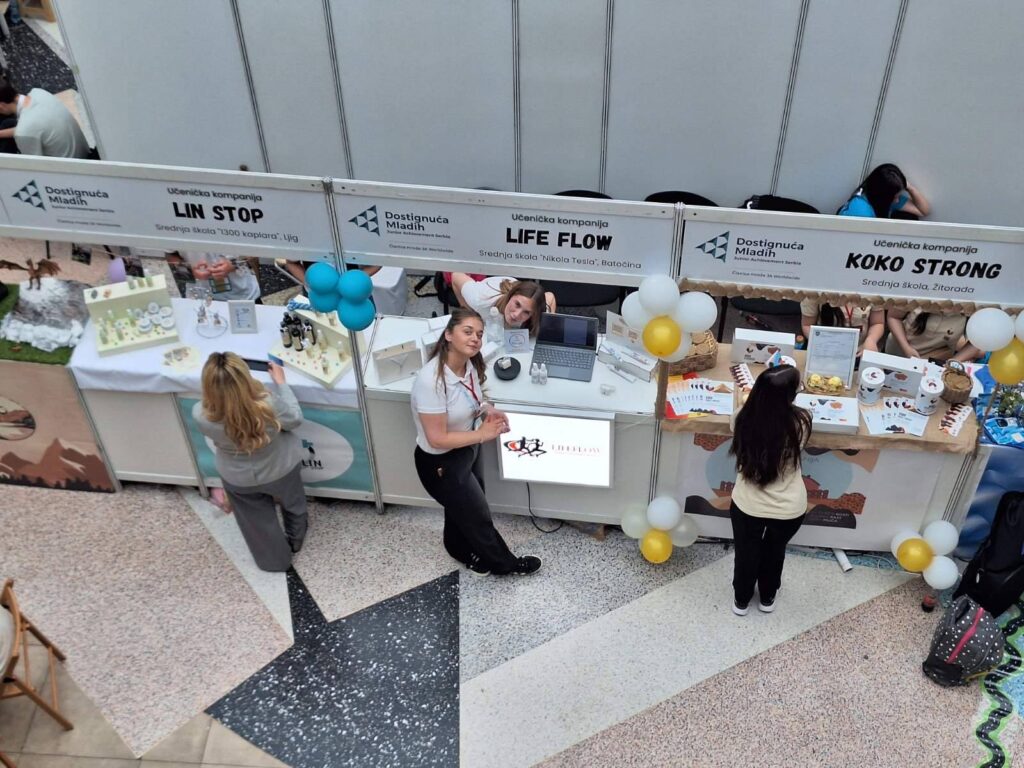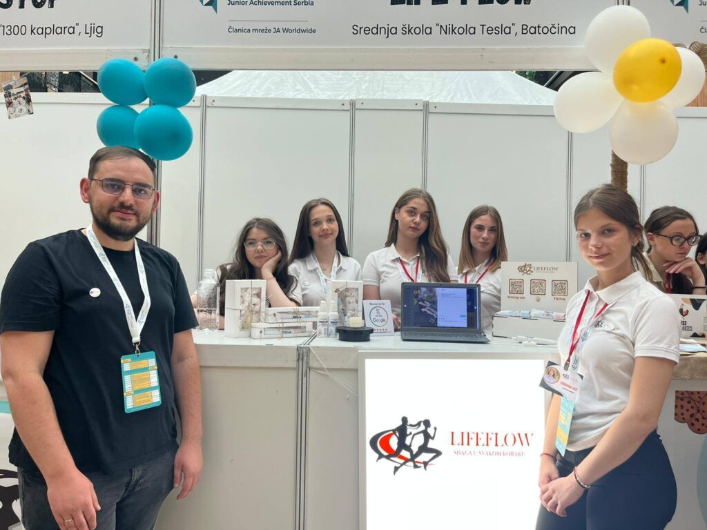 Пет предузетница са својим професором Марком Илићем, током три предузетничка дана поносно су представљале СШ „Никола Тесла“ на Националном такмичењу ученичких компанија Достигнућа Младих у Србији / Junior Achievement in Serbia.