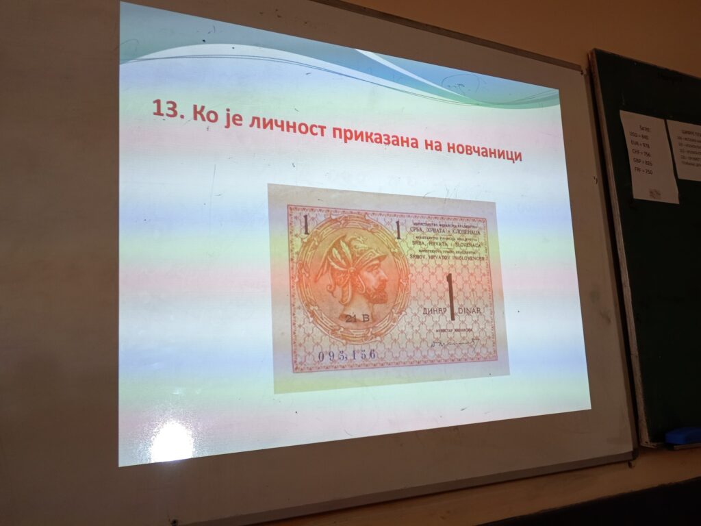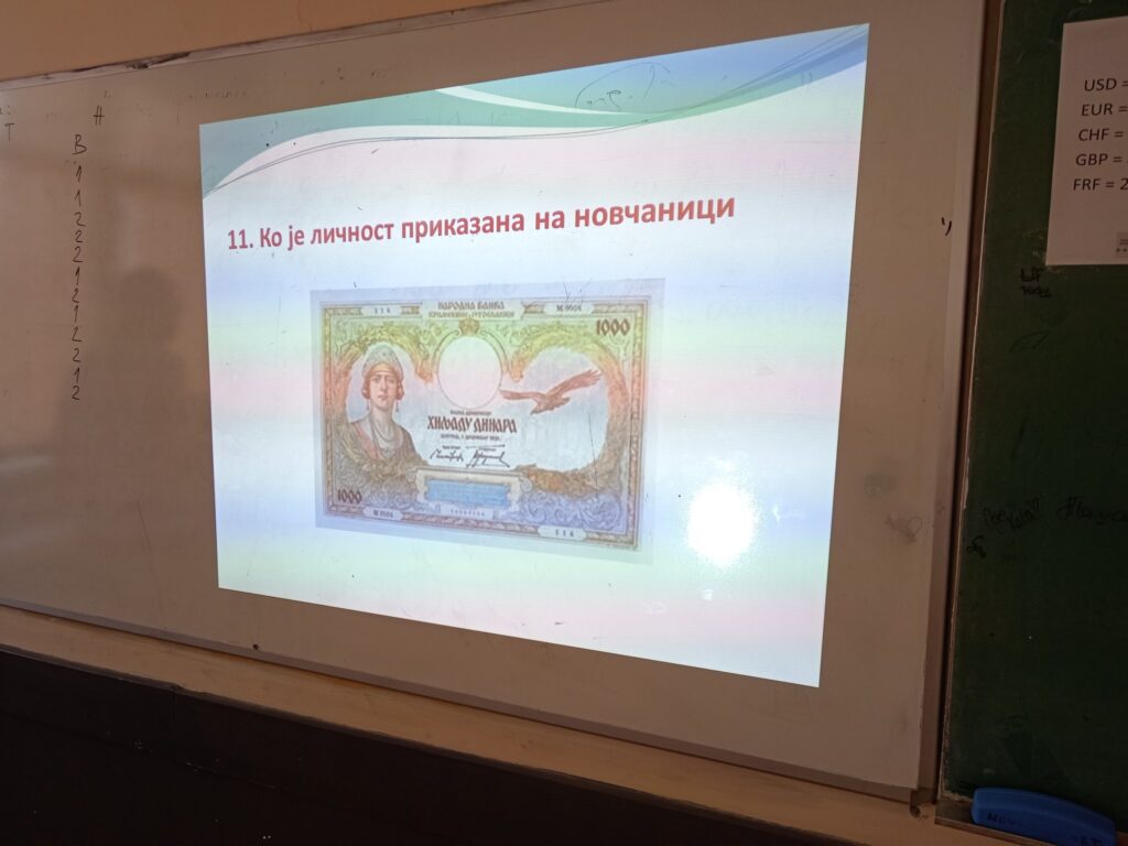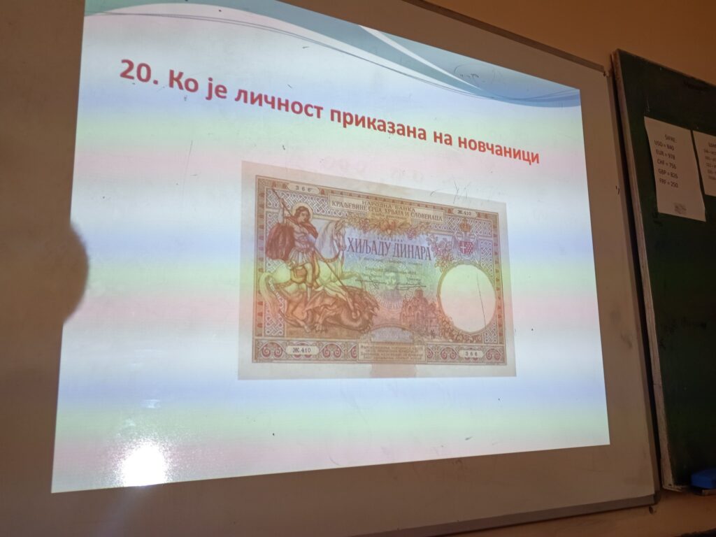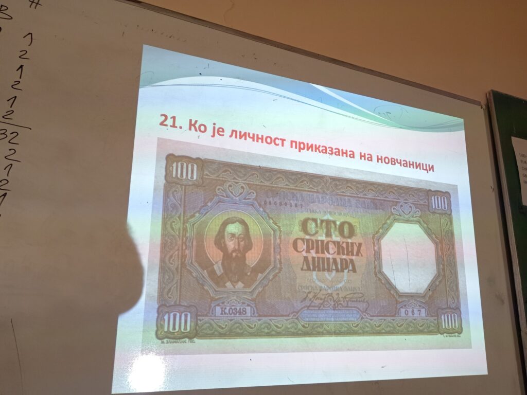 Ученици су кроз питања препознавали личности од значаја за нашу науку, културу, историју које су приказане на лицу новчаница и показали познавање значајних чињеница из њихових биографија.