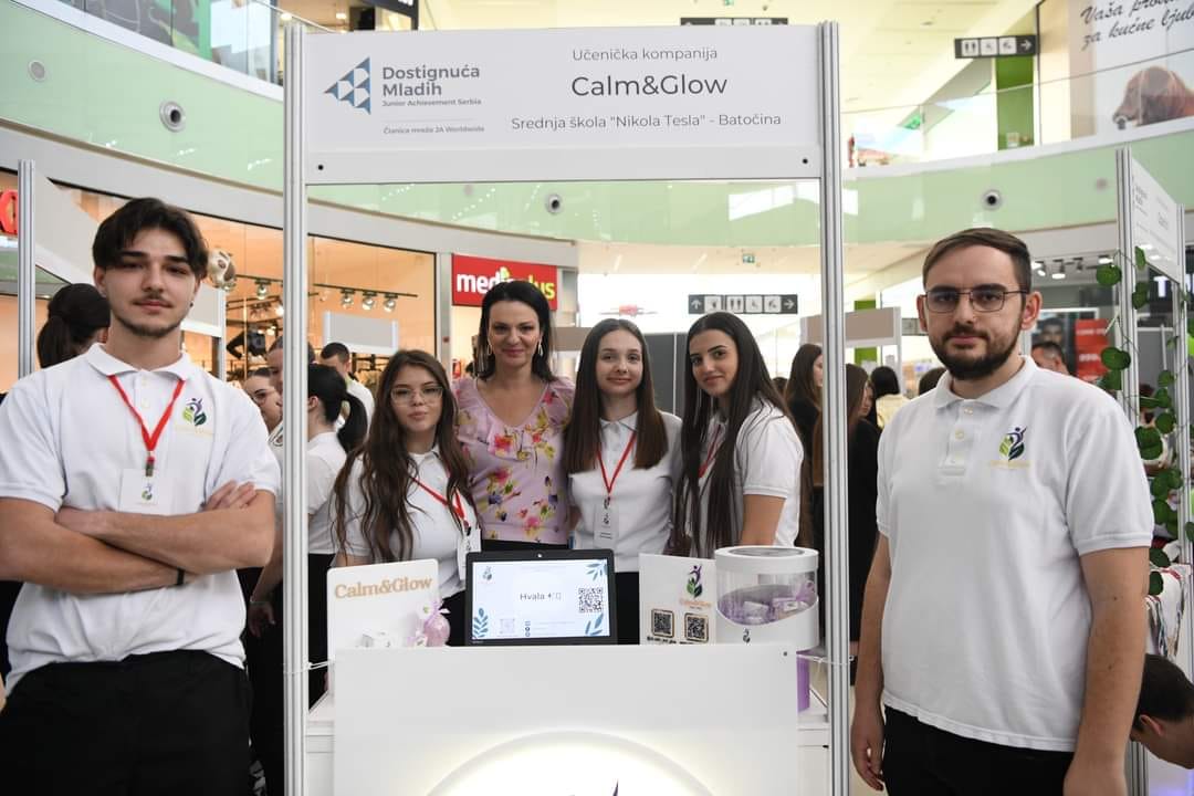 Ученици наше школе и чланови компаније Calm&Glow Јана Радомировић, Милица Стојановић, Александар Стојановић и Катарина Ристић уз менторство наставника Марка Илића и бизнис менторке Бојане